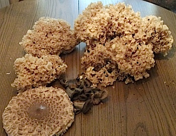 Foto: Eine Krause Glucke, reichlich Pfifferlinge, wenige Semmelstoppelpilze. Von letzteren hat Alexander viele stehen gelassen.