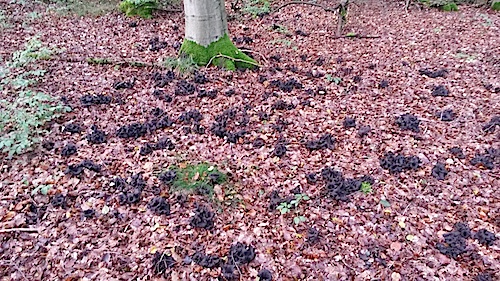Foto: Welch ein Anblick! Überall schwarze Flecken mit den begehrten Trompetenpfifferlingen. Auch sie wachsen in diesem Jahr wie seit Jahren nicht mehr. (2 Fotos © Margarete)