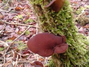 2 Fotos: Nach längerer Pilzpause, die der Wald sich mal gönnte, fand Jürgen Judasohren (links) sowie ausgewachsene Samtfußrüblinge (rechts). Letztere sind nicht nur sehr gute Speisepilze, sondern auch wertvolle Gesundheitspilze. Auf dem Foto hierunter rechts sieht man, wie die Judasohren den alten Holunderstrauch besiedelt haben. (3 Fotos © Jürgen)