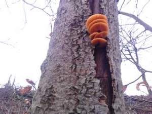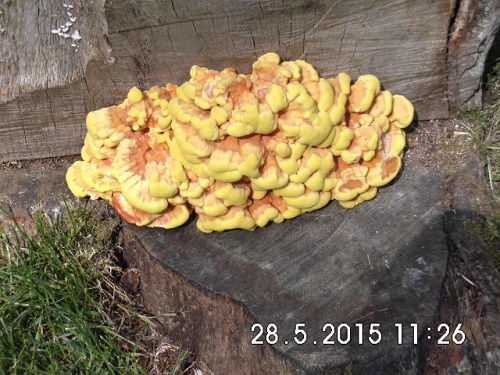 Foto: Gelborange quillt und quirlt es aus dem abgesägten Eichenstamm. Es ist ein Schwefelporling. Jung ist er essbar.