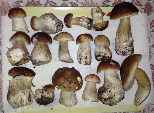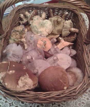 Da viele kleine zerbrechliche Pilze im Korb waren, habe ich mir, um sie nicht zu verletzen, dieses Mal das Auspacken gespart und lediglich den vollen Korb fotografiert, siehe rechts.