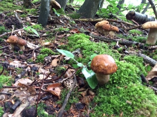 Dort konnten wir unsere Körbe, wie auf dem Foto rechts zu sehen ist, wieder gut füllen. Zwar mussten wir manchen Steinpilz mit den Waldbewohnern teilen, aber am Ende hat es doch für alle gelangt.