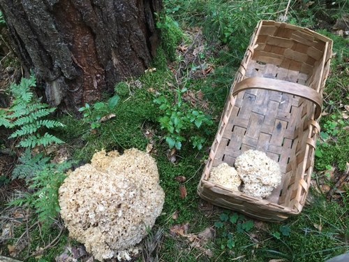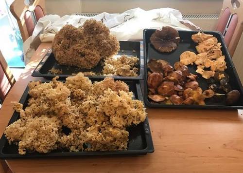 Es gab viele große Krause Glucken, die meisten waren aber schon zu alt. Da ich nur eine Tasche dabei hatte, musste ich vorzeitig Schluss machen. Eine stattliche Breitblättrige Glucke fand aber noch Platz in der Tasche. Immerhin, auf dem Heimweg konnte ich noch ein paar Rotfuß- und Goldröhrlinge mitnehmen.