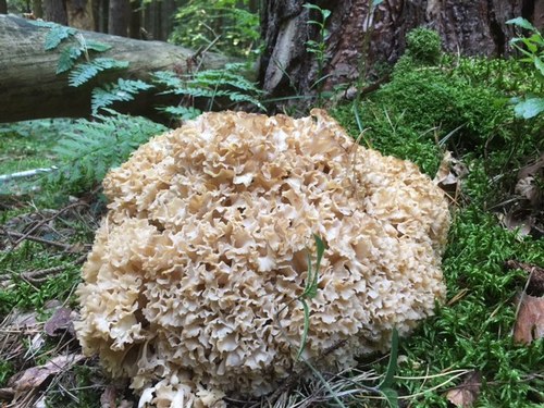 Foto: Die Krausen Glucken wie diese sind relativ unabhängig von der aktuellen Wetterlage. Sie ernähren sich von toten organischen Substanzen oder vom Kernholz verwundeter, aber noch lebender Bäume, fast immer der Waldkiefer.
