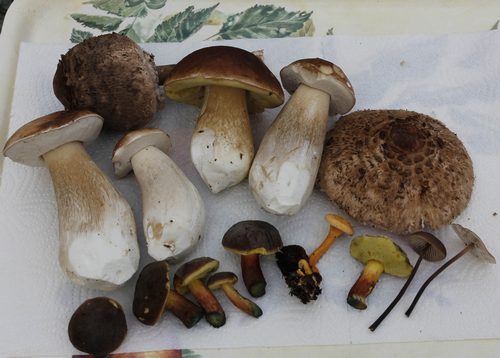 Foto: Schöne Steinpilze, Parasole, Rotfüße, ein falscher Pfifferling und zwei Knoblauchschwindlinge ergaben für Peter eine willkommene Pilzernte. Langsam findet er den Glauben an die Pilze wieder.