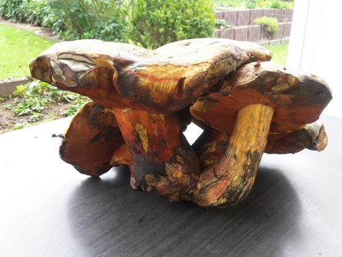 Das Highlight war aber ein Nest von Flockenstieligen Hexenröhrlingen, die teils zu merkwürdigen Skulpturen, bestehend aus bis zu fünf Exemplaren, verwachsen waren. Trotz der Größe waren alle noch fest und daher uneingeschränkt verzehrtauglich.