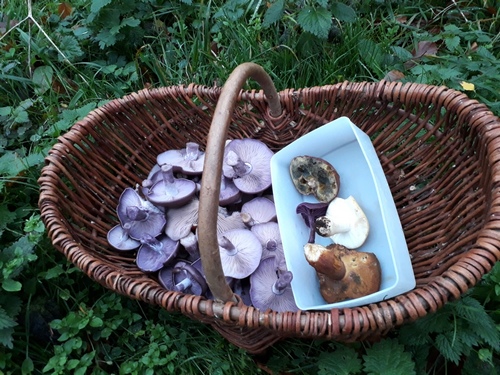 Marone und Hasenröhrling im Korb waren nicht mehr zu gebrauchen, der Täubling war ziiieemlich scharf :D. Den Lila Lacktrichterling hatte ich nur zum Betrachten wegen seiner (für mich) verhältnismäßig imposanten Größe mitgenommen.