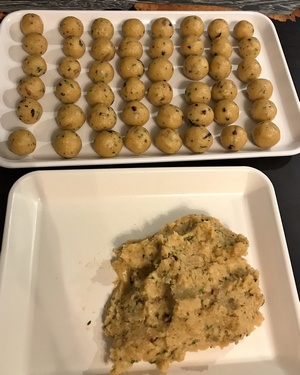 1 Stunde stehen lassen und die so entstandene Masse zu kleinen Klößchen formen (Foto rechts).