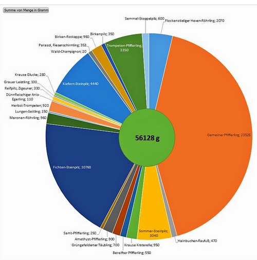 Grafik: In diesem Diagramm führt Stefan seine in diesem Jahr gefunden Pilzarten nach Gewicht auf. Platz 1 schaffen die Pfifferlinge (orange) mit 23,5 Kilo; Platz 2 gehört mit 10,7 Kilo den Fichtensteinpilzen (dunkelblau); die Bronzemedaille geht an die Kiefernsteinpilze (mittelblau) mit 4,4 Kilo. Platz 4 erreichen die Trompetenpfifferlinge (grün) mit 3,3 Kilo, Platz 5 die Sommersteinpilze (sattgelb) mit gut 3 Kilo. Insgesamt brachte Stefan 56 Kilo und 128 Gramm bester Speisepilze mit nach Hause!