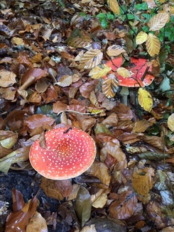 2 Fotos: Zu schade wäre es gewesen, wenn Tobias den schönen Steinpilz (links) vor einer Hainbuche nicht rechtzeitig abgeholt hätte und er dem Verderben anheim gefallen wäre. Die Fliegenpilze zeigen, dass es derzeit in den Eberstädter Wäldern immer noch eine gute Zeit für die beiden gegenseitigen Zeigerpilze ist.