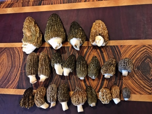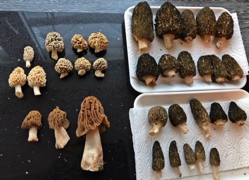 Foto: Neben typischen Zipfelmützen waren auch einige Spitzmorcheln in Rundform (Morchella elata, Var. rotunda) an Stefans bewährtem Ernteplatz nachgekommen. So hat sich sein Umweg auf der Fahrt zum Arbeitsplatz gelohnt.
