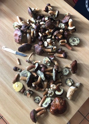 Butterpilze und Körnchenröhrlinge gefunden. Und Vierbeiner Abby hat schön auf einen Maronenröhrling aufgepasst (1. Foto rechts).