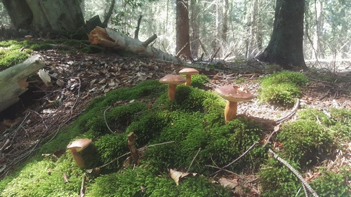 Foto: Eine wunderschöne Impression mit stämmigen Maronenröhrlingen, fotografiert von Detlef im Darßwald, Teil des Nationalparks Vorpommersche Boddenlandschaft.