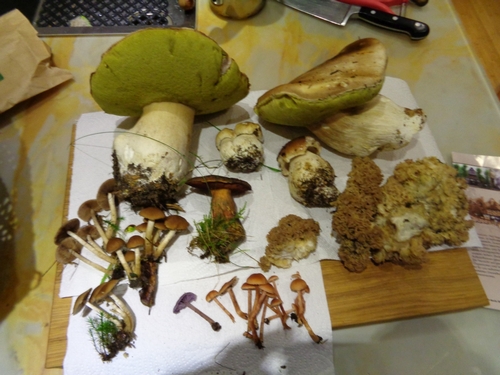 Lila und Rötliche Lacktrichterlinge, Steinpilze (u. a. 550 und 450 Gramm), Flockenstieligen Hexenröhrling, Krause Glucke, Weißstieliges Stockschwämmchen.
