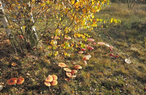 unter fast jeder Birke eine Gruppe von Fliegenpilzen, eine schöner als