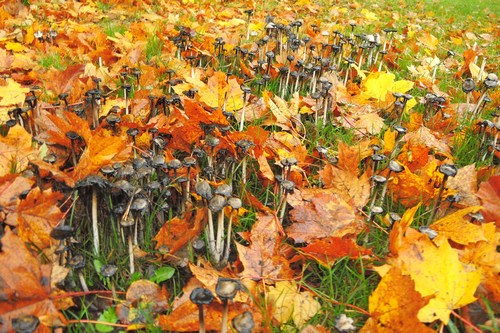Foto: Die Schopftintlinge vergehen, die welken Ahornblätter beginnen die Leichname zuzudecken. Ein Pilzfriedhof im hohen Herbst, der nicht minder stimmungsvoll das Ende der Saison symbolisiert. (3 Fotos © Gisela)