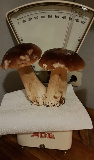 Foto: Drei mächtige Steinpilze an ihrem Fundort im Landkreis Gifhorn. Die Zusammengewachsenen sehen wir auf dem zweiten Foto auf der herrlichen Antikwaage: knapp 800 Gramm zeigt sie für sie an. (3 Fotos © Sebastian)