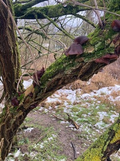 2 Fotos: Arnold begeistert die Winterpilzsuche. Nach schönen Austernpilzfunden hat er nun Samtfußrüblinge (links) und Judasohren (rechts) entdeckt, die er vorsorglich von einem Pilzberater bestimmen und sich zum Verzehr freigeben ließ.