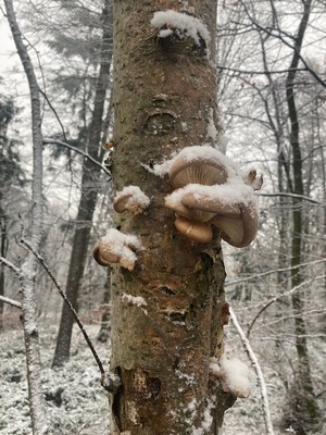 Anmerkung: Schade, dass die Baumart, an der die Pilze wuchsen, nicht benannt wurde, denn darum ging es Thomas in seiner Betrachtung. Nach dem Foto ist die Art nicht eindeutig zu erkennen, fast könnte man meinen, es handele sich um einen toten Fichtenstamm, an dem Austernpilze in seltenen Fällen auch wachsen.