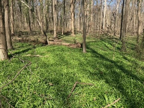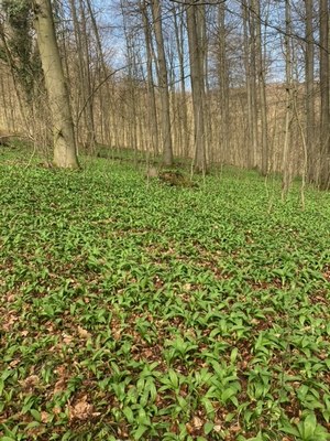 Foto: Der Wunderlauch stammt aus dem Kaukasus und wurde nach dem 2. Weltkrieg vermutlich von russischen Besatzern eingeschleppt. Er schmeckt etwa wie Bärlauch, bietet aber alle Pflanzenteile zum Verzehr an. Ein freudiges Ereignis ist das dennoch nicht: die rasant sich ausbreitende Pflanze bedroht einheimische Arten, zum Beispiel das Buschwindröschen, dessen frühe Blüten von den breiten, ausladenden Blättern erdrückt werden. In der vorderen Eilenriede gibt es, wie hier zu sehen, inzwischen weitläufige Teppiche, deren Ausbreitung kaum noch zu bekämpfen ist.