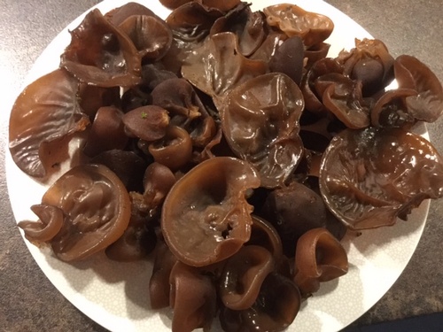 Für die Judasohren habe ich ein tolles Rezept von unserer chinesischen Nachbarin bekommen. Sie war ganz aus dem Häuschen über die Funde beider Pilzarten. Die Judasohren kennt sie unter dem Namen Mu-Err, was soviel wie Holz-Ohr heißt. Auch von ihnen habe ich die Kleinen übrigens stehen gelassen. Es handelt sich um eine unglaublich ergiebige Stelle mit sehr alten Holunderbäumen. Jetzt weiß ich endlich, wie es auszusehen hat, wenn man diese Pilze erfolgreich suchen will.