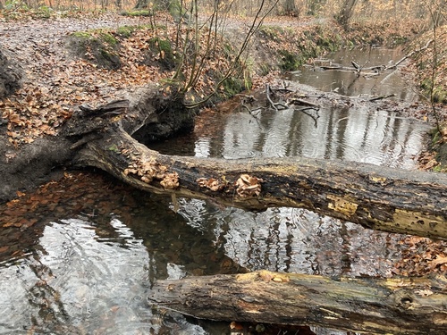 Foto: Dies könnte doch glatt der Bach sein, über dem Michael und Thomas vom Pilz-Ticker-BaWue einen mit Austernpilzen bewachsenen alten Rotbuchenstamm bei Hochstetten im Landkreis Karlsruhe mehrmals abgelichtet hatten. Das Bild zeigt aber einen Bachverlauf im Seelhorster Wald, unweit von der Eilenriede in Hannover, Deutschlands größtes geschlossenes innerstädtisches Waldgebiet. Auch dieser Stamm wird von (alten) Austernpilzen besiedelt.