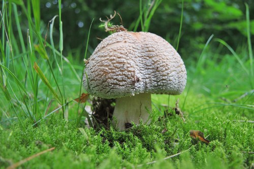 Foto: Ein überaus prächtiger Perlpilz, wohl der Schönste, der je auf dieser Website gezeigt wurde. Gisela nahm ihn aus Vorsicht nicht mit. Dabei zeigt er in der Hutmitte die für ihn typische fleischrötliche bis rosabraune Färbung. Die Rötung im Fleisch offenbart sich eher bei älteren Pilzen, gerne im Stiel. Perlpilze schmecken noch besser als ohnehin schon, wenn man ihre Huthaut und die Velumreste sorgfältig abzieht.