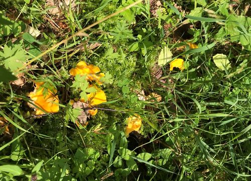 Foto: Schon auf dem Rückweg, dem Auto nahe, entdeckte Petra die goldgelben Flecken im Gras seitlich des Weges. Sollten das etwa...? Ja, Uwe und seine Glücksbringerin durften sich ganz unerwartet über schöne Pfifferlinge freuen. (2 Fotos © Uwe)