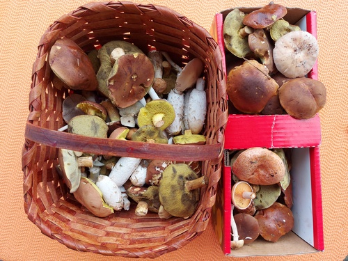 Trotz vieler Pilzsammler haben wir zwei Körbchen voll bekommen. Folgende Pilze sind darin gelandet: Maronen, Rauhfüße, Edelreizker, Kiefernreizker, Perlpilze, ein Parasol und Orangegelbe Scheidenstreiflinge.