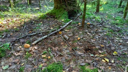 Ich fand große Gesellschaften von Birkenpilzen und Steinpilzen. Auch Maronen sieht man jetzt vermehrt und immer wieder kleine Grüppchen Rotkappen. Bei den Steinpilzen waren viele Pilze wieder madig, allerdings konnte ich aufgrund des überwältigenden Angebots genug schöne Exemplare sammeln. So kann es weitergehen!