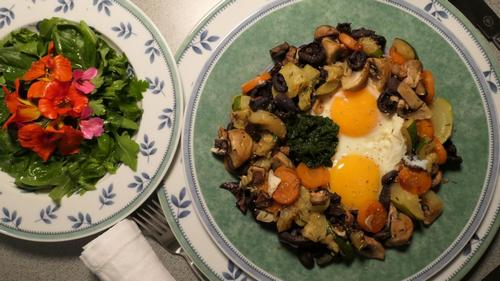 Foto: Da hauen wir ein Ei drüber, nämlich über die einheitlich dunkelbraun gewordenen Lila Lacktrichterlinge, deren Lamellen vor dem Pfannengang noch unterschiedliche Farbtöne hatten (2. Foto).