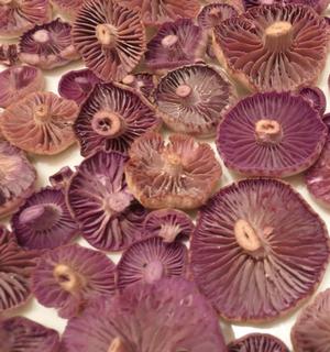 Beim Putzen der Trichterlinge faszinierte mich die Vielzahl der violett-rosa-beigen Farbvarianten. Leider behielten die Pilze ihre hübschen Farben nicht bei der Zubereitung.