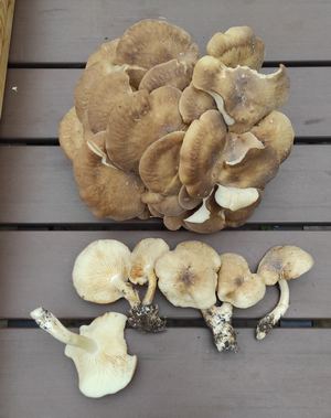 Als wir uns bereits mit den Fahrrädern auf dem Rückweg befanden, sind wir schließlichnoch über ein Pilzbüschel am Wegesrand gestolpert. Unsere Recherche hat ergeben, dass es sich mit ziemlicher Sicherheit um Raslinge handeln müsste. Die Beschreibungen, die wir gefunden haben, weisen bei der weiteren Spezifizierung eindeutig auf den Panzerrasling hin. Liegen wir wohl richtig?
