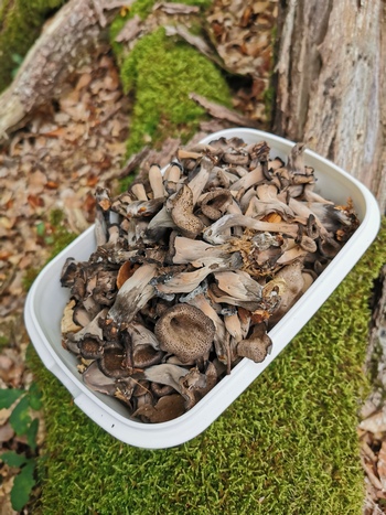 Foto: Es waren vor allem die Herbsttrompeten (Totentrompeten) in der Mitte des Bildes, die Matthias im Deister jubeln ließen. Nach einigen Ausfalljahren waren sie zu seiner Freude endlich wieder da. Das 2. Foto zeigt, dass er eine gehörige Menge finden konnte. Dazu gab es fünf große Pfifferlinge, einen Batzen Trompetenpfifferlinge (rechts) sowie etliche Semmelstoppelpilze.