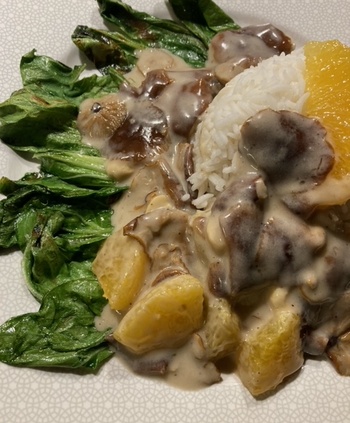 Es gab Samtfußrüblinge mit Kokosmilch, Orangenfilets und Cashewkernen, dazu einen Hauch Sojasauce und frischen Koriander. Das alles an Reis. Als Beilage gab es gebratenes Pak-Joy-Gemüse (Foto rechts).