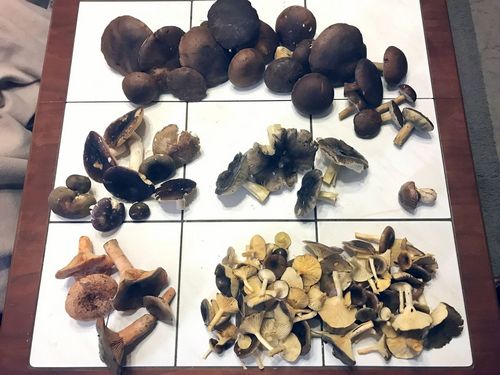 Foto: Eine tolle Ausbeute für den wohl letzten Pilzgang des Jahres gab es für Uwe. Unten rechts die Frostschnecklinge, darüber in der Mitte die Schwarzfaserigen Ritterlinge. Ganz oben etliche schöne Maronenröhrlinge.