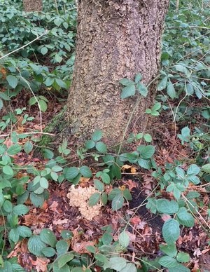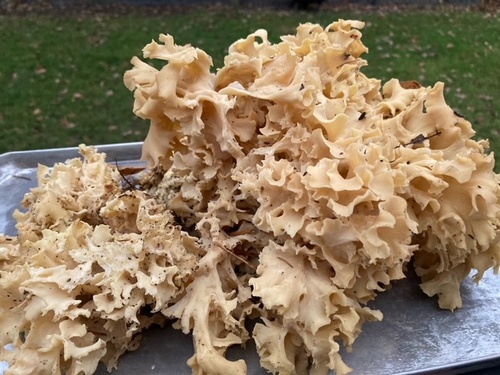 Foto: Trotz vorausgesagten Schneefalles ist sie für Arnolds Kinder gewachsen, die Krause Glucke. Arnold hat sie am Fuße einer Kiefer(?) im Brombeergestrüpp entdeckt (2. Foto).