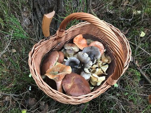 Foto: Ein Korb voll schöner später Pilzvielfalt, mit der Uwe so spät im November nicht mehr gerechnet hatte. Am meisten überrascht war er von einigen Schwarzfaserigen Ritterlingen und von der Vielzahl der Frostschnecklinge. (3 Fotos © Uwe)