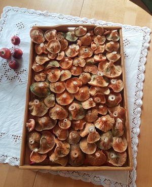 Da Arnold auch so spät im Pilzjahr immer noch überall und nirgendwo herumstromert und Ausschau hält, war es eher kein Zufall, dass er die große Menge Trompetenpfifferlinge "ganz unscheinbar unter einigen alten Fichten im Norden von Hannover entdeckte". Die gegabelten Leistung und welligen Hüte der Pilze finde er "optisch toll" (2. Foto rechts). Den Großteil des Fundes trocknete er im Dörrautomaten.
