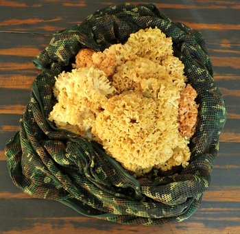 Außer gefühlten 10.000 Falschen Pfifferlingen, hunderten Birnenstäublingen, einer Handvoll Sandröhrlingen, drei Braunhütigen Eispilzen (oder auch Gallertiger Zitterzahn) und einer deutlich überständigen Ma(t)rone, gefiel nur eine mächtige Krause Glucke von über zweieinhalb Kilo Gewicht in gutem Zustand (Foto rechts).