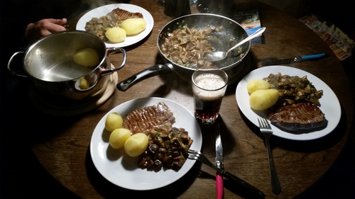 Mit der Ausbeute waren wir rundum zufrieden und so ließen wir uns am Sonnabend eine Mischpilzpfanne mit drei anständigen Stückchen Fleisch schmecken.