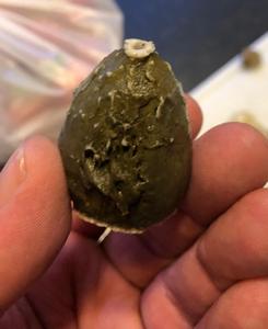 2 Fotos: Wir sehen bei der Zubereitung das noch weiß umhüllte Hexenei (links) und das innere olivgrüne Ei (rechts), das in Scheiben geschnitten, gebraten - und gegessen wird. Der Pilz schmeckt rettichartig. In manchen Regionen Frankreichs gilt dies als große Delikatesse und einige Pilzfreunde haben das auch auf dieser Website bekundet, siehe z. B. hier und hier.