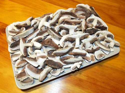 Derzeit sind drei Bleche im Backofen - ein komplett mit Pilzscheiben gefülltes Haushaltssieb wartet noch.