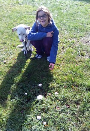 Foto: Cara hat die Wiesenchampignons als Zutat für die Rahmsauce bereits gesäubert und geschnitten. Es gibt sie zu Bandnudeln mit Broccoli und Kalbsschnitzel. Vierbeiner Odin auf dem zweiten Foto durfte beim Säubern den einen oder anderen Pilz naschen - er steht auf Champignons. (2 Fotos © Wulff)