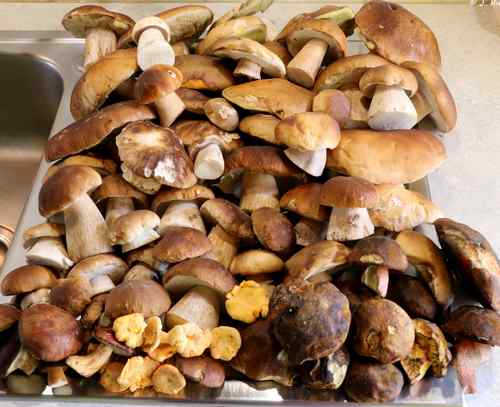 Foto: Das Ergebnis einer Runde mit den Hunden ist dieser Fund von vielen Steinpilzen sowie einigen Pfifferlingen, Maronen und Flockigen Hexen. Beatrice und Jürgen haben die Pilze unverhofft im Galgenvenn gefunden, genau dort, wo sie 12 Tage zuvor nicht einen Pilz gesehen hatten. (3 Fotos © Jürgen)