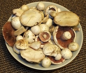 Im Gegensatz zum Wald ist hier der Regen noch im Boden angekommen. Viele Fruchtkörper waren umgetreten oder zertreten. Wir konnten trotzdem mehr als zwei Dutzend schöne, kernige Champignons in verschiedenen Größen retten, darunter auch einige kapitale Exemplare.