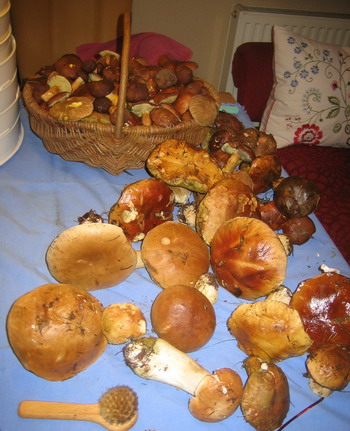Die Ausbeute vergrößerte sich noch um reichlich Maronen, Violette Lacktrichterlinge, Semmelstoppelpilze, Hexenröhrlinge und Violette Rötelritterlinge. Ein kulinarisches Wochenende steht bevor!