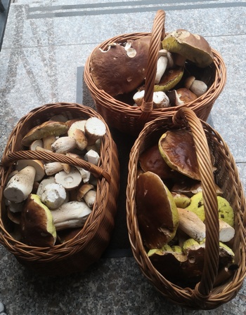 Wir kamen aus dem Staunen nicht heraus, was da alles vor uns stand. Es waren geschätzt hunderte von Steinpilzen, vom münzgroßen Knirps bis zu stattlichen Veteranen war alles dabei. Wir hatten unsere Körbe im Nu gefüllt und sind beinahe geflüchtet.