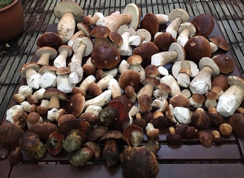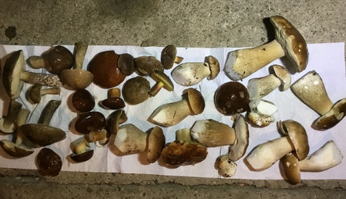 Foto: Der Samstagsfund. Den zahllosen 1A-Steinpilzen gesellten sich Flockenstielige Hexenröhrlinge, ebenfalls in Topqualität, hinzu. Sind das Pilzwochen für Michael, Anja und Ella!
