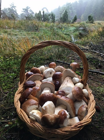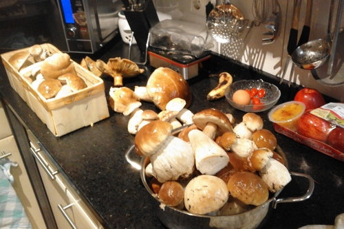 Wir haben momentan den Höhepunkt der Pilzsaison, man braucht nicht zu suchen, sondern nur rechts und links vom Weg einzusammeln. Das Foto oben zeigt meine heutige Ausbeute bei einer Hunderunde. Ich nehme nur die schönsten Pilze mit und lasse zu kleine und zu große stehen. Heute waren es Steinpilze, Birkenpilze, Maronen und Herbstrotfüße.